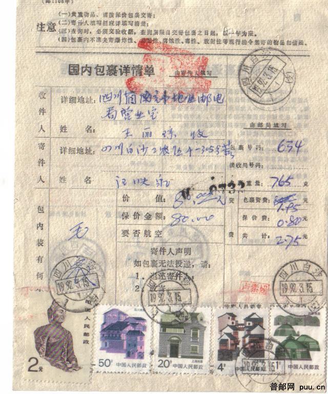 贴2元石窟和4枚民居普票包裹单一件