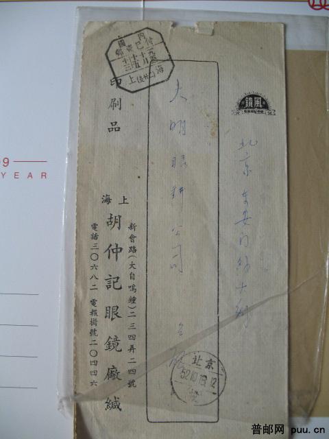 1952年上海寄北京盖邮资已付戳广告封一件