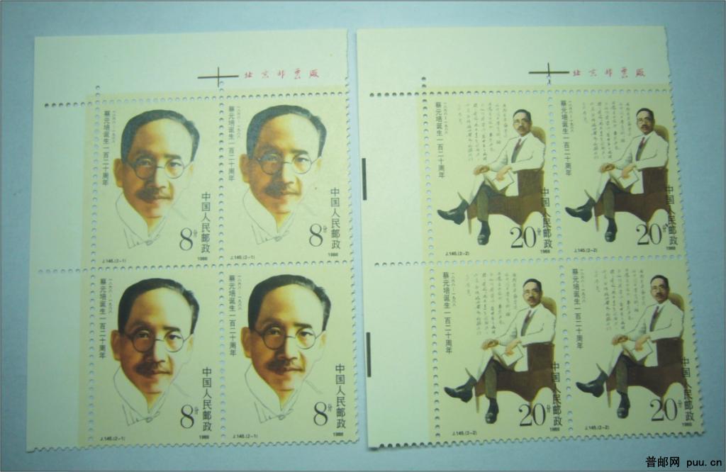 j.145 蔡元培诞生120周年邮票 左上直角厂铭四方连