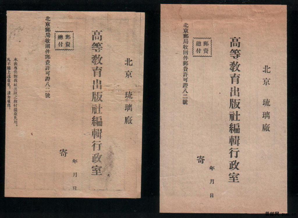 邮资总付--邮简--高等教育出版社编辑行政室 2种不同 合拍