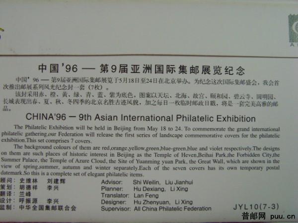 JYL10中国96--第9届亚洲国际集邮展览纪念封(七彩封 一套7枚)