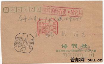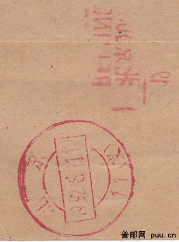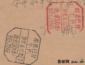 同天收寄盖[邮资己付]不同颜色.戳内文字编排却不同封
