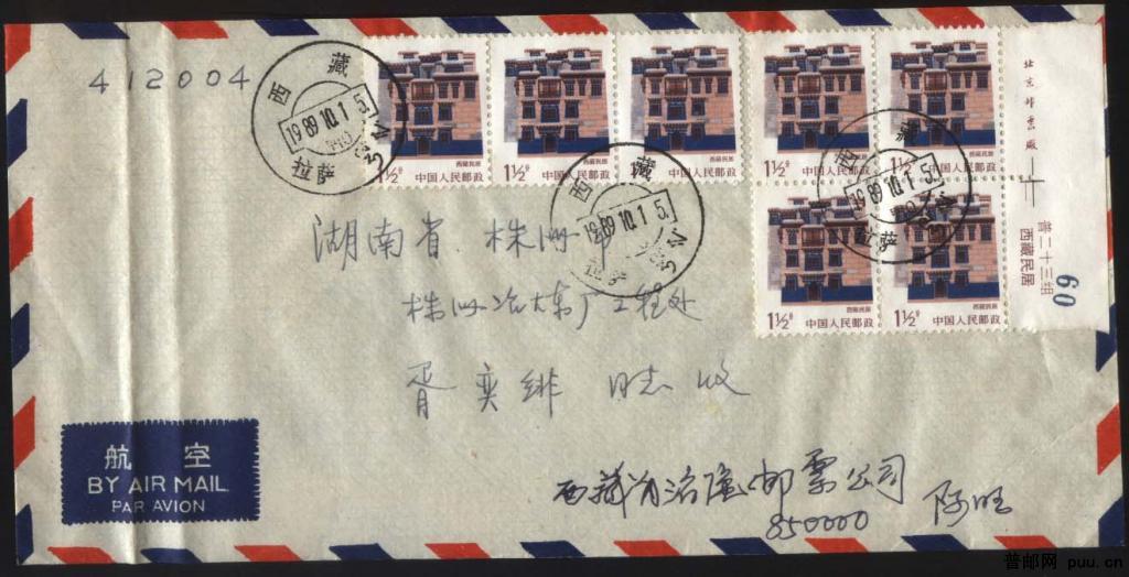 西藏民居 1989.10.1.拉萨航空信寄湖南 实寄封