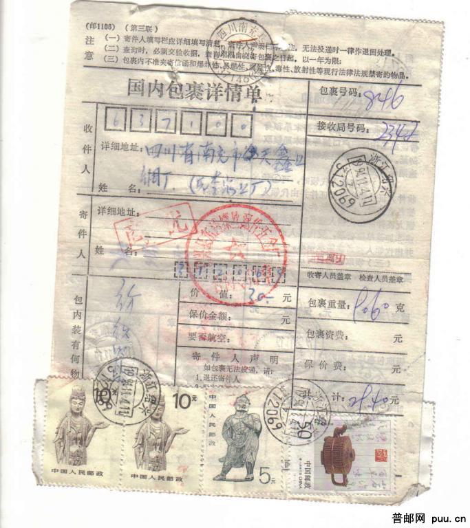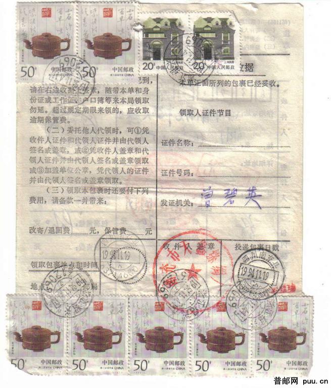 贴菩萨普票。94-50分票包裹单一件