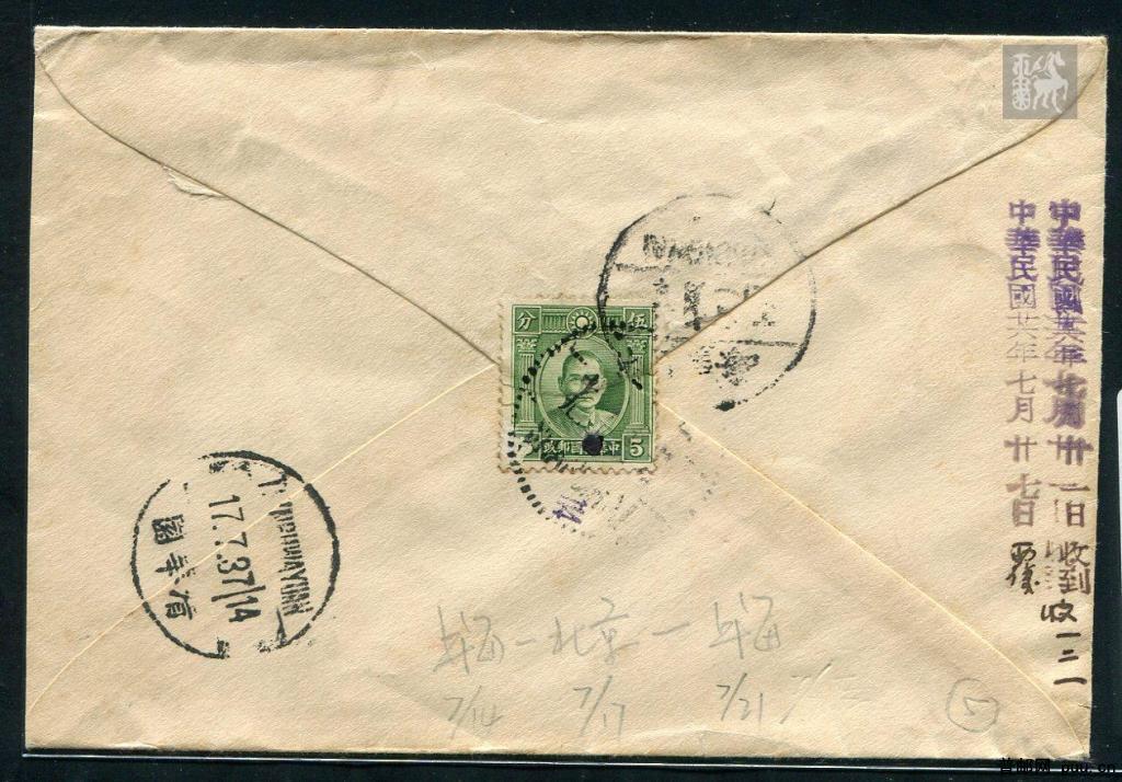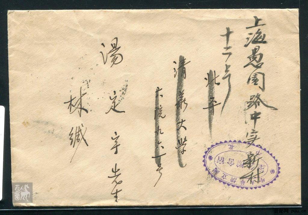 贴民孙像5分上海实寄北京清华大学退寄上海封一枚(销七七事变后清华园最后的戳)