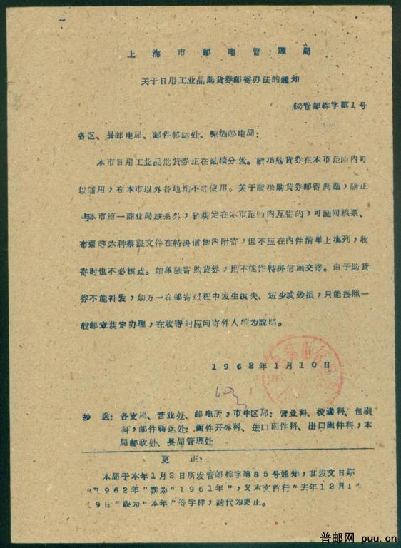 1962年上海邮电管理局文件---关于特种挂号件寄日用工业品购货劵办法通知
