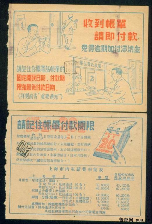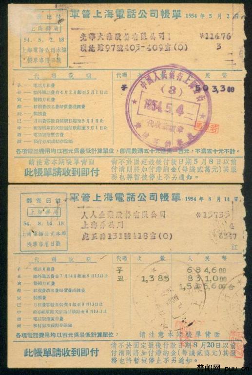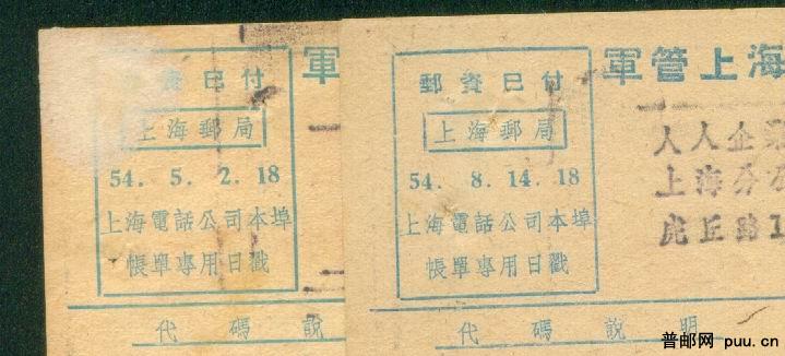 1954年 预印邮资已付上海邮局本埠账单专用戳 军官电话公司账单2枚