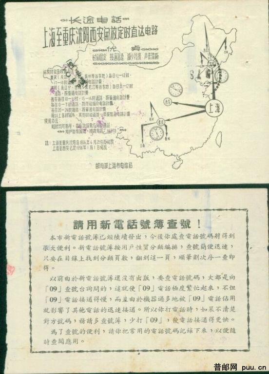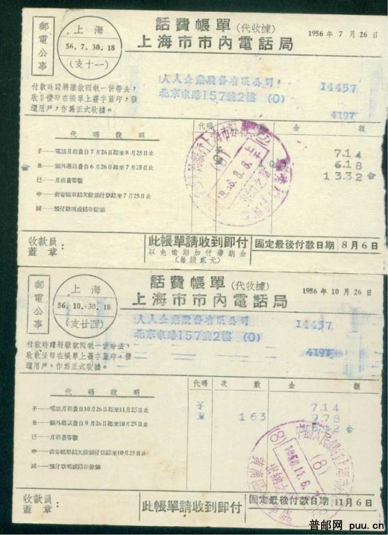 1956年 预印 邮电公事专用戳 上海11支24支电话账单2枚