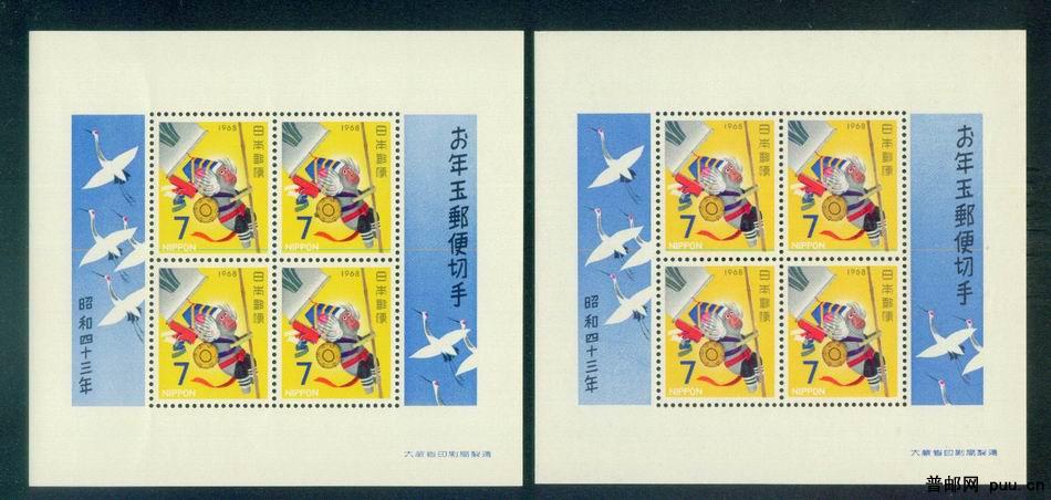 日本贺年生肖小型张 未使用 1968年--- 猴 2枚