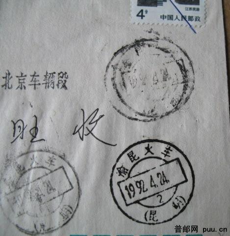 1992年销“渝昆火车(昆明)”火车戳寄北京欠资封