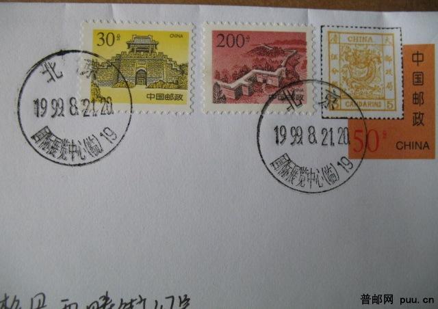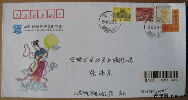 99世界邮展国内邮简加贴长城票国内挂号实寄封,销国展临19戳