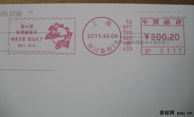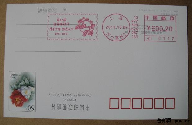 第42届世界邮政日上海四川路桥局纪念邮资机戳明信片一枚