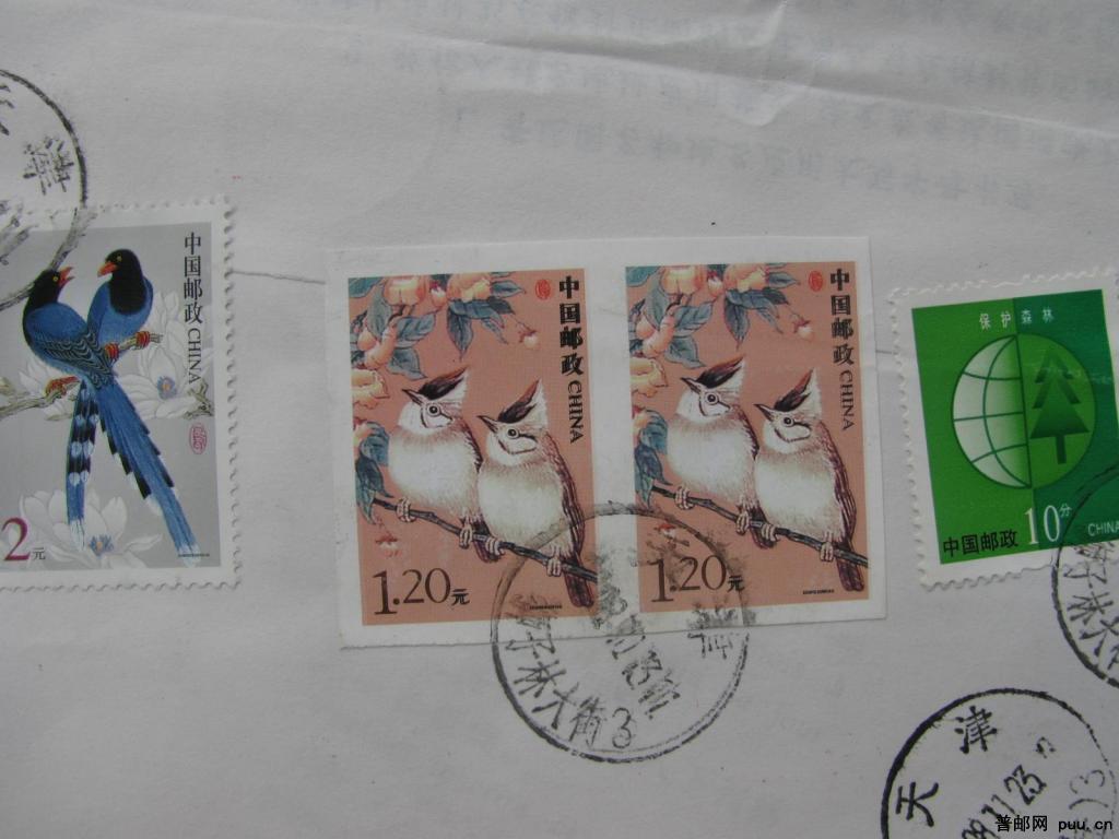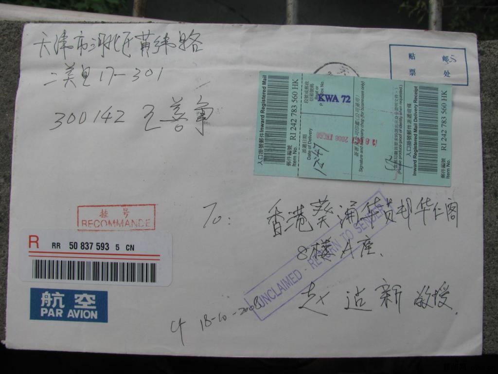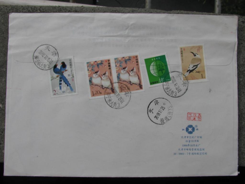 贴中国鸟第一种赝品1.2元双联天津寄香港航空挂号改退封