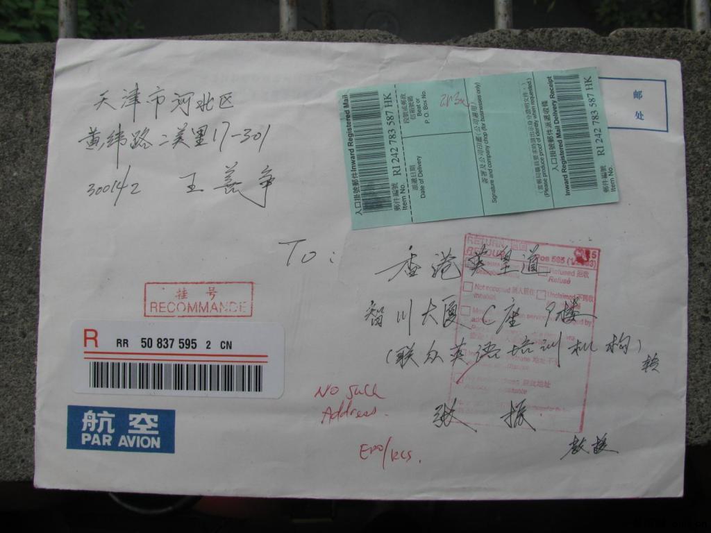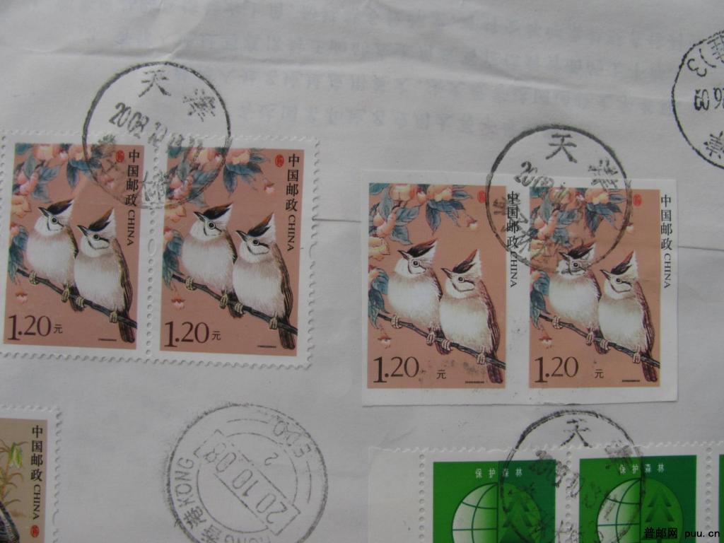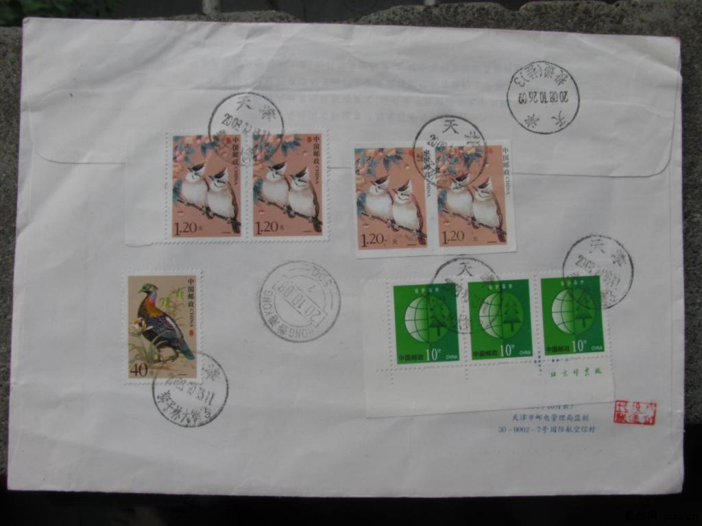 天津寄香港航空挂号改退贴中国鸟1.2元第二种无齿赝品双联