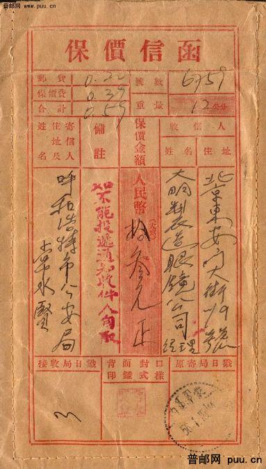 1956年1月内蒙古呼和浩特寄北京保价信函实寄封