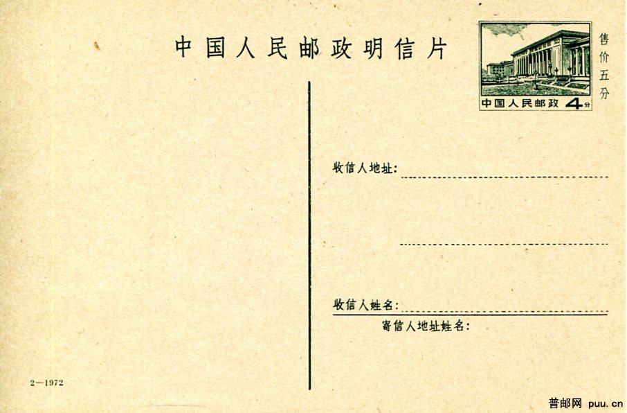 普14型人民大会堂图邮资明信片 2-1972 4分全新
