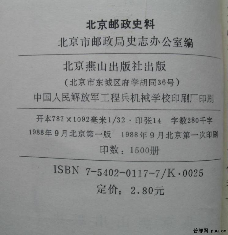 1988年北京燕山出版社出版《北京邮政史料》一册