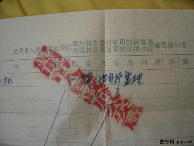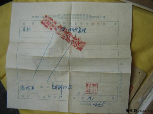 拍 普4 昆明(投)戳封(含公安局对军事物品处理通知书)
