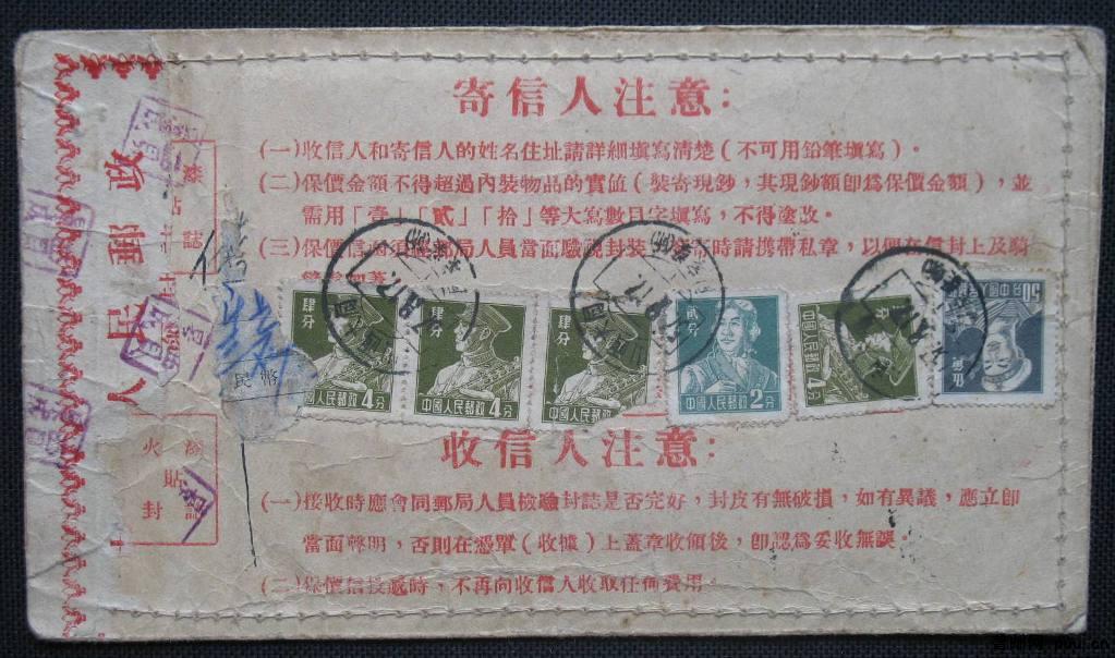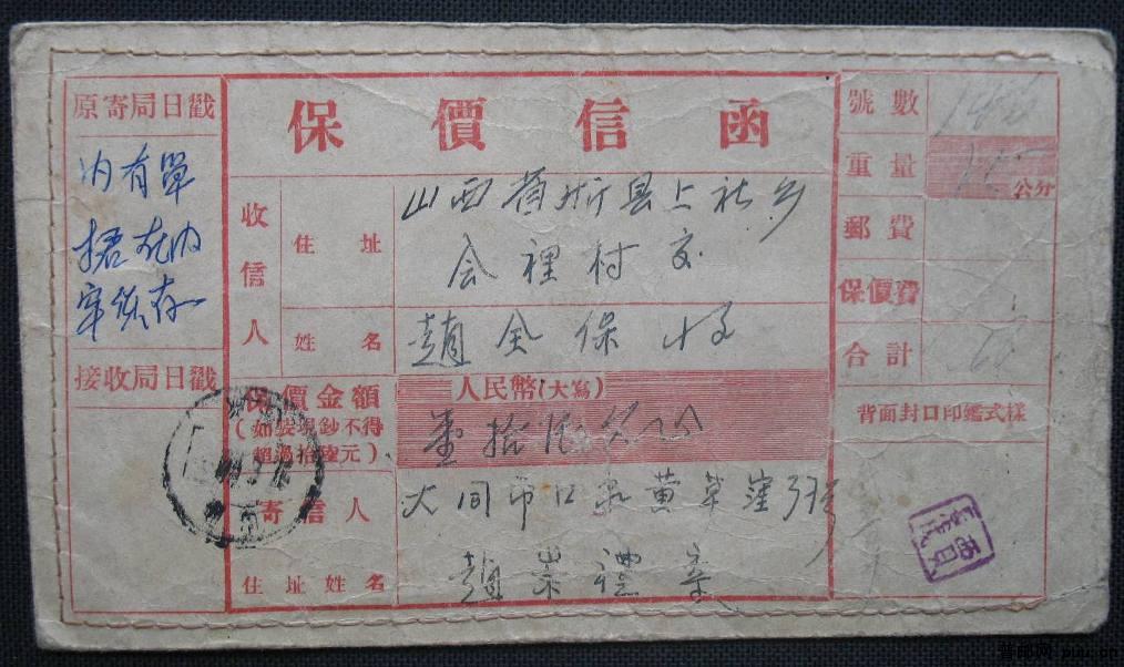 1957年山西大同寄山西忻县保价信函实寄封一件(山西宽腰款戳)