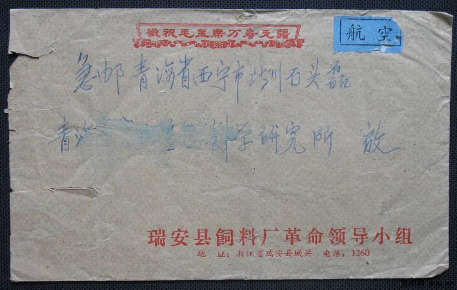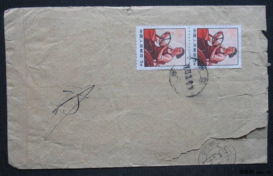 1973年贴普无号5分拖拉机手双联票浙江瑞安寄青海西宁航空平信实寄封一枚