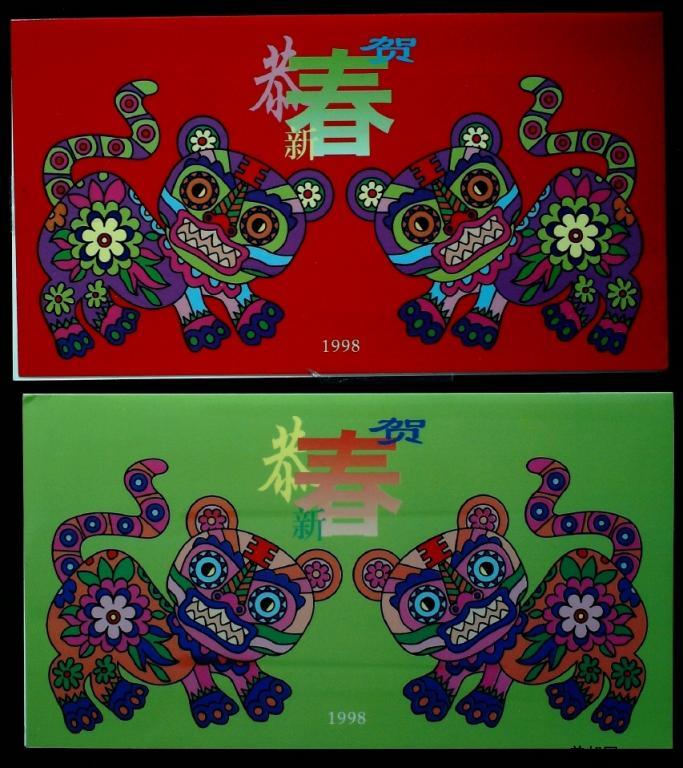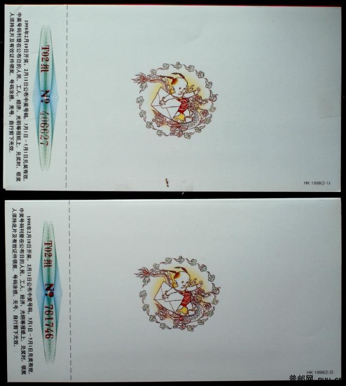 1998年虎年贺年明信片贺卡2枚,有兑奖号和编号