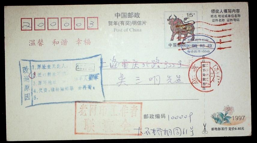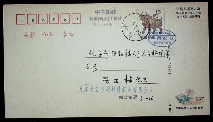 1997年牛改片实寄片2枚北京、天津各一枚,其中一枚改退有相关戳记