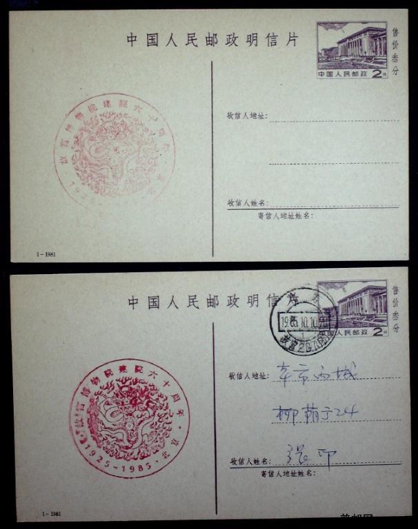 1985年故宫博物院建院六十周年纪念戳片两枚其中一枚实寄销北京故宫207所戳