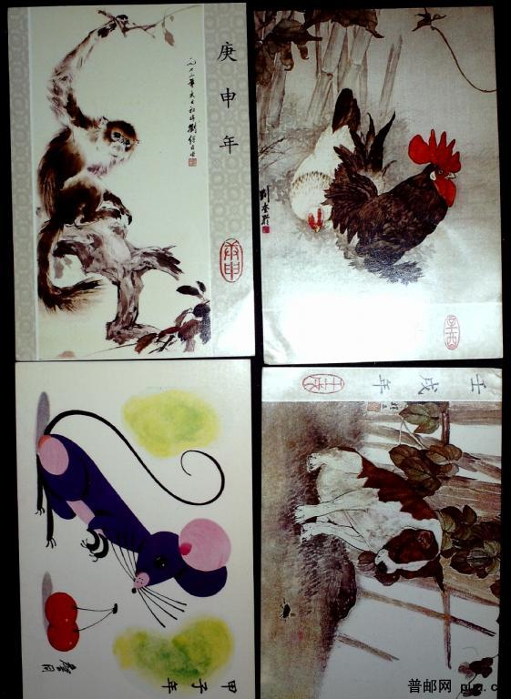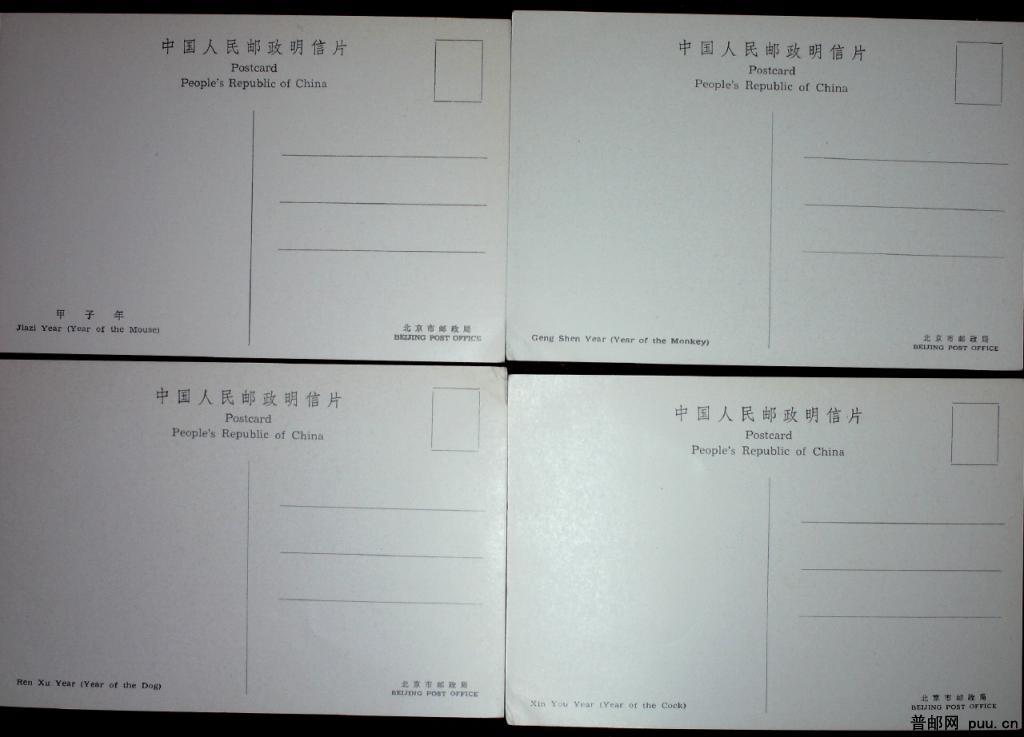 北京邮政局发行80、81、82、83生肖图案明信片4枚