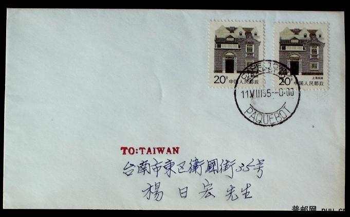 1995年贴民居20分两枚销轮船邮件戳寄台湾实寄封一枚