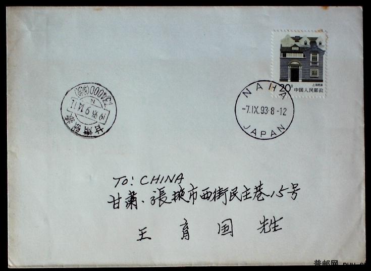 1993年贴民居20分国际轮船邮件寄甘肃张掖实寄封一枚