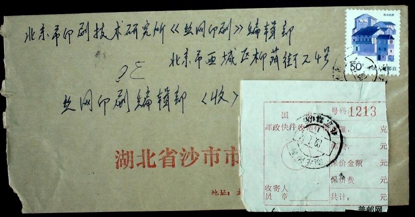 1989年1月14日湖北沙市寄北京快件实寄封一枚(五格式快件签条与贴票同时存在封上)