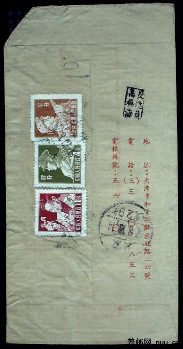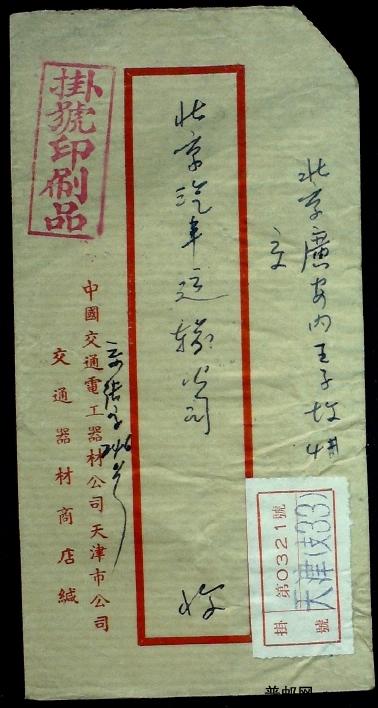 1957年3月天津寄北京挂号印刷品实寄封一枚(普8 10分早期使用)
