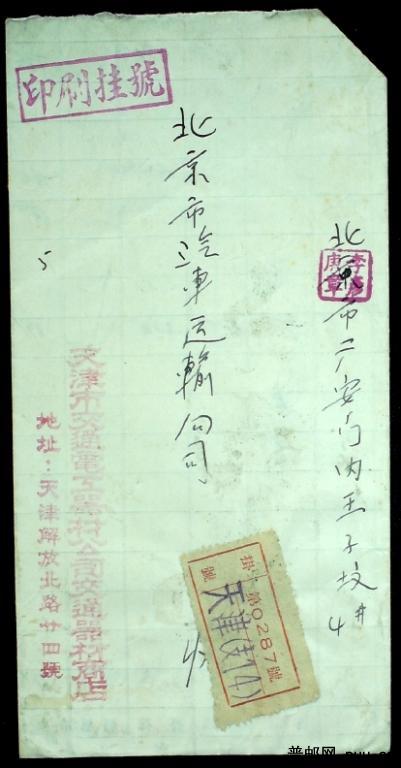 1957年9月天津寄北京挂号印刷品实寄封一枚