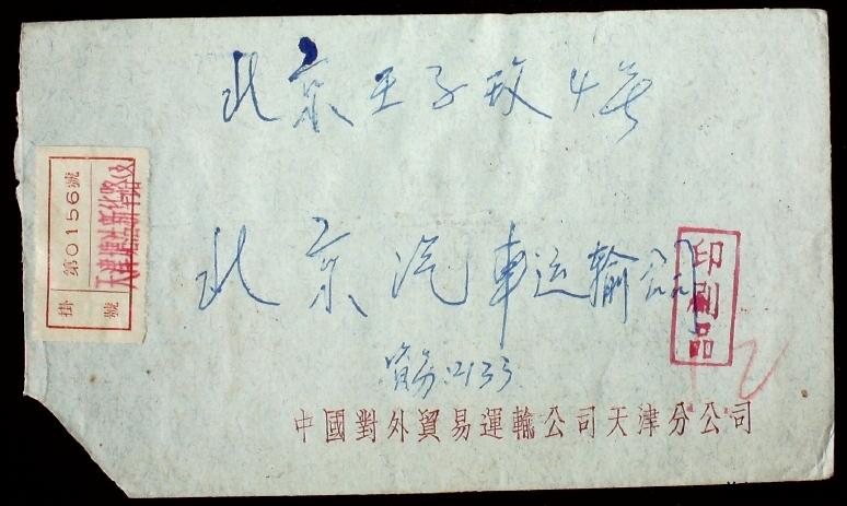 1957年8月天津塘沽新华路支局寄北京挂号印刷品实寄封一枚