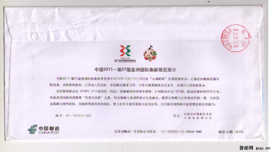 中国2011-第27届亚洲国际邮展执委公函封,实寄,内有公函