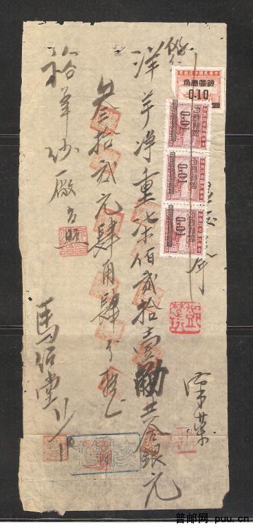 民国时期,贴银圆一分3枚、十分1枚印花税票单一件