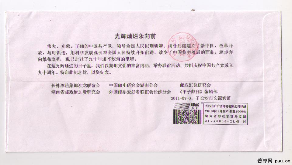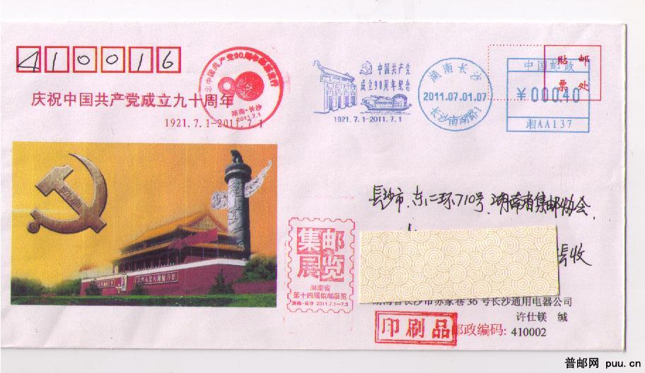 中国共产党九十周年邮资机联体宣传纪念戳实寄
