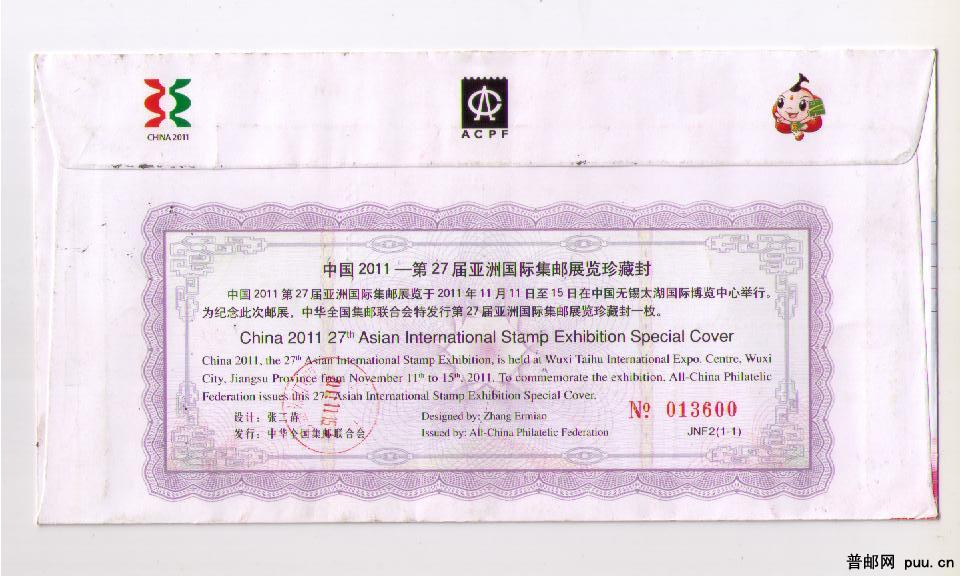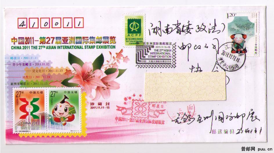 中国2011-第27届亚洲国际邮展珍藏封,实寄,