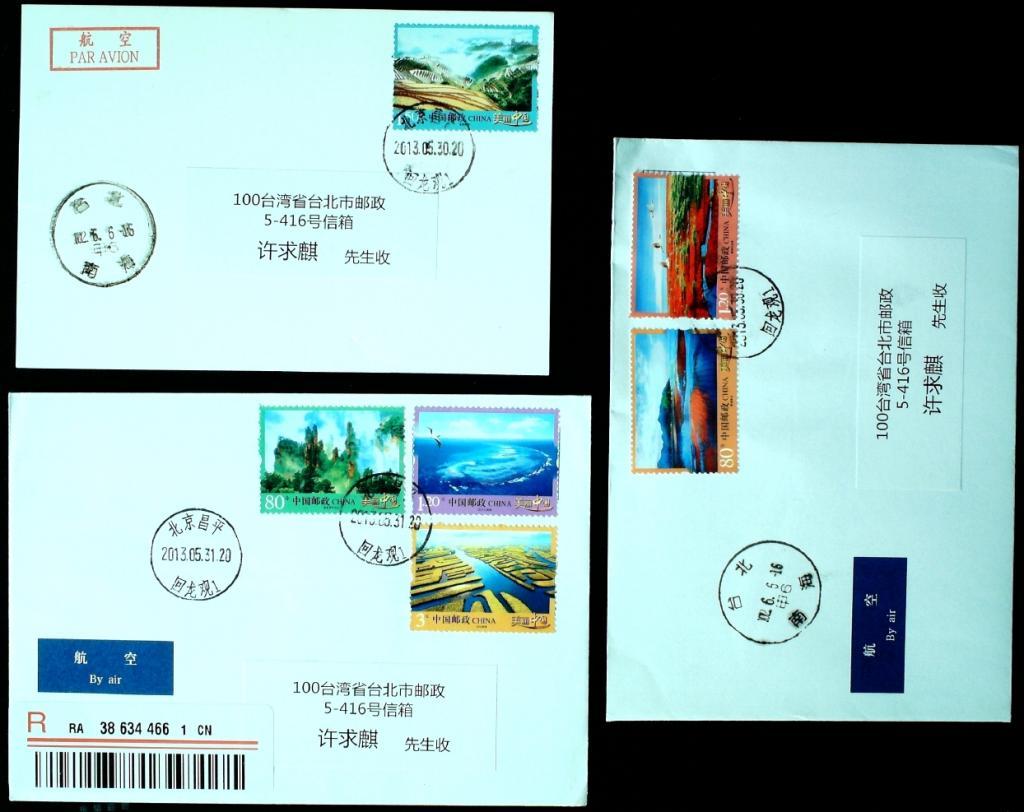 普32套票分贴航空挂号、航空平信、航空明信片符资邮票发行当月寄台湾实寄封片一组