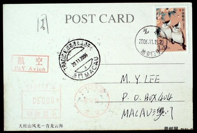 普31 1.2元北京首日邮资机补资航空寄澳门实寄明信片一枚