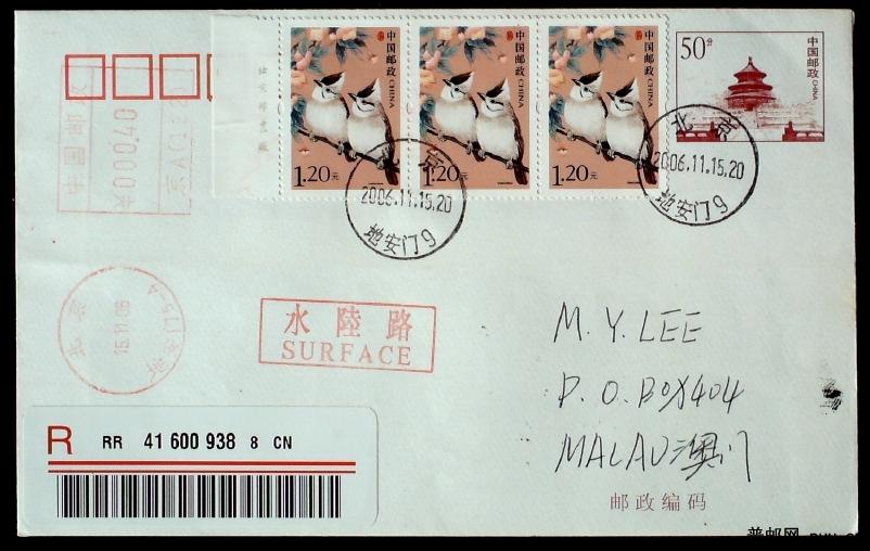 普31 1.2元厂铭横3联北京首日使用邮资封邮资机补资水陆路挂号寄澳门实寄封一枚