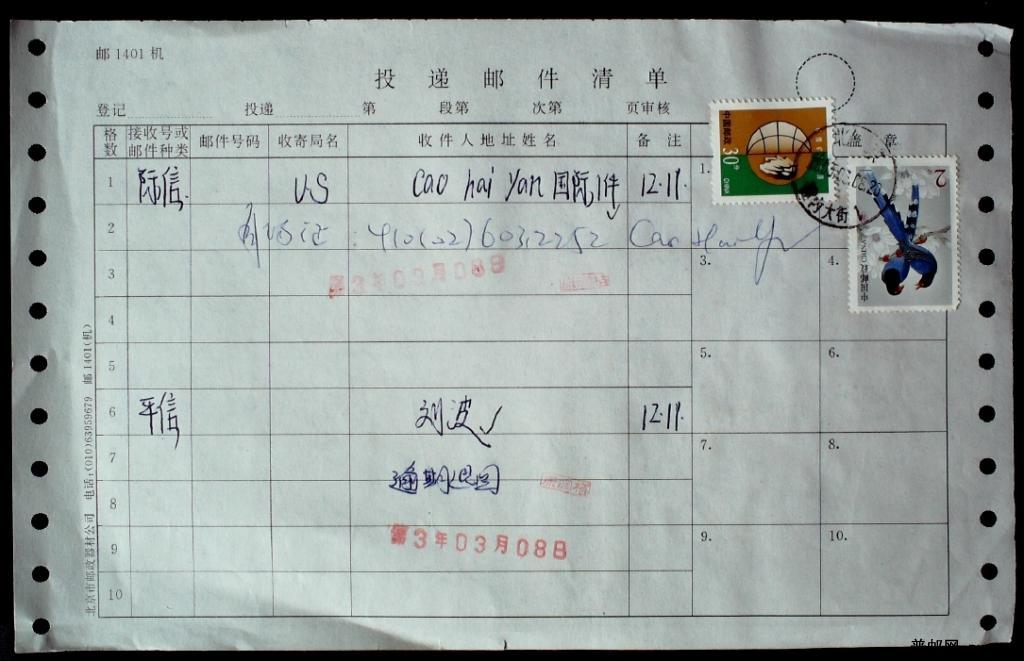 2003年北京建内大街邮局投递邮件清单1