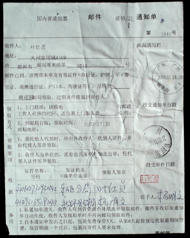 国内包裹催领通知单贴中国鸟1元3枚