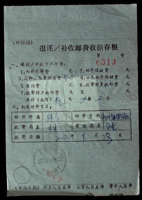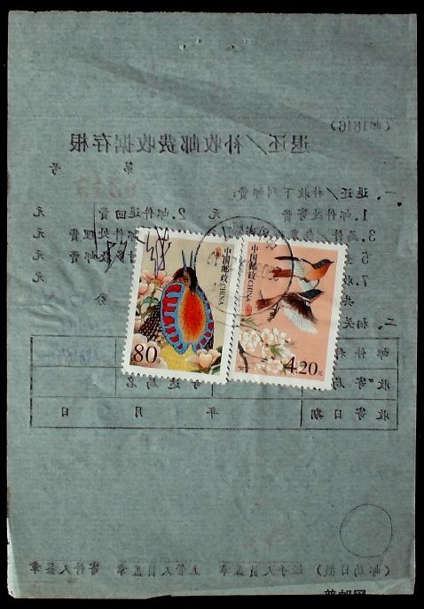 2003年广西桂林贴鸟票4.2元合计5元包裹验关费单据一枚