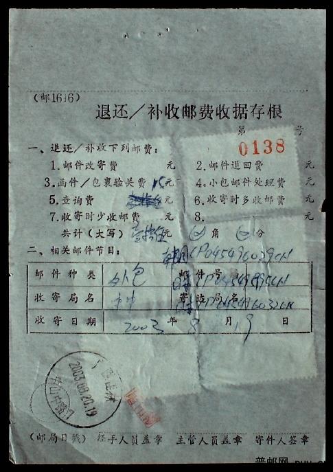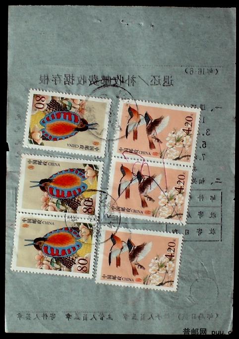 2003年广西桂林贴鸟票4.2元合计15元包裹验关费单据一枚