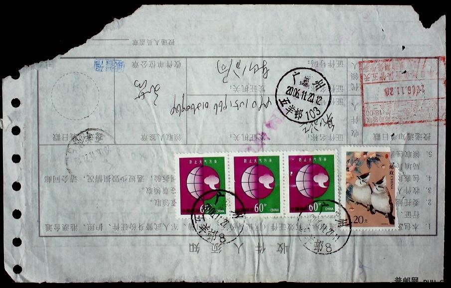 2006年11月普31 1.2元票首月在包裹单上自然使用