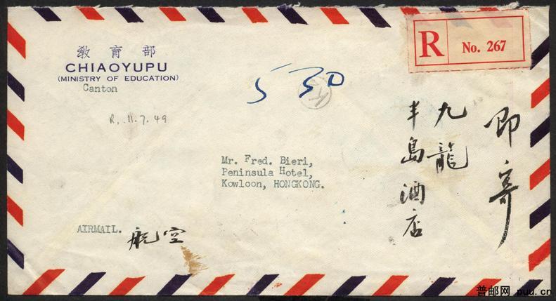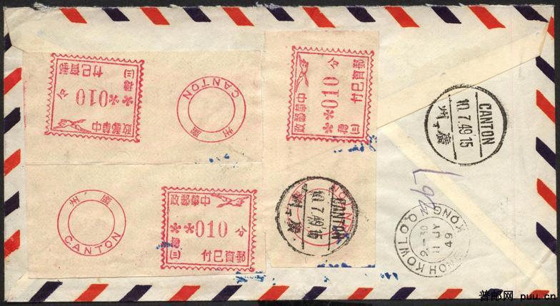 1949年10月7日,贴盖穗三邮资机戳面值30分印有“中华邮政”签条的邮资已付广州寄香港九龙国内航空挂号实寄封