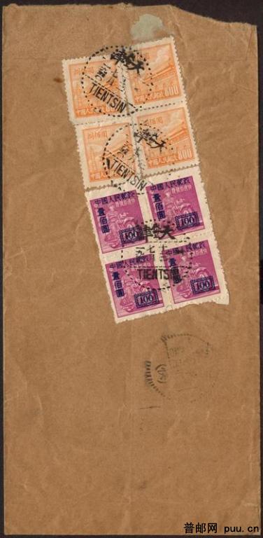 1950年7月13日贴普1 800元四枚、改1 100元四枚共3600元邮资盖天津“代卅三”、北京“快”字戳双挂快实寄封(右上800元为子模特征票)