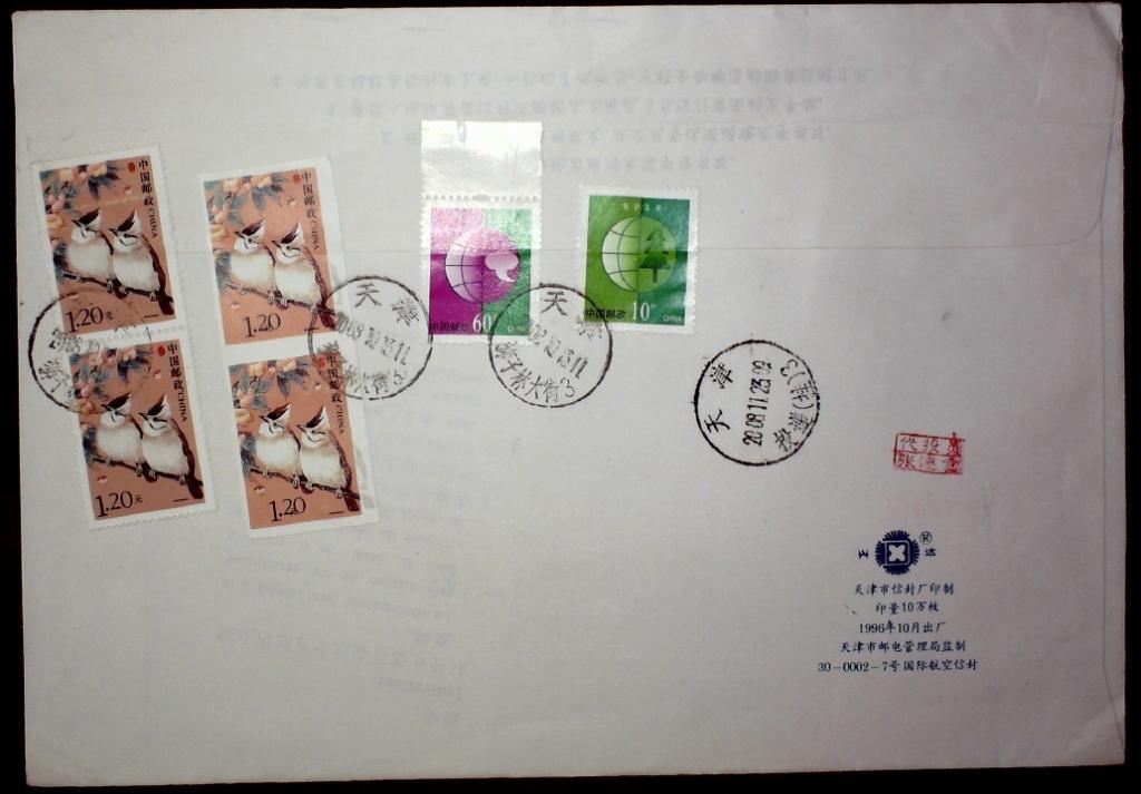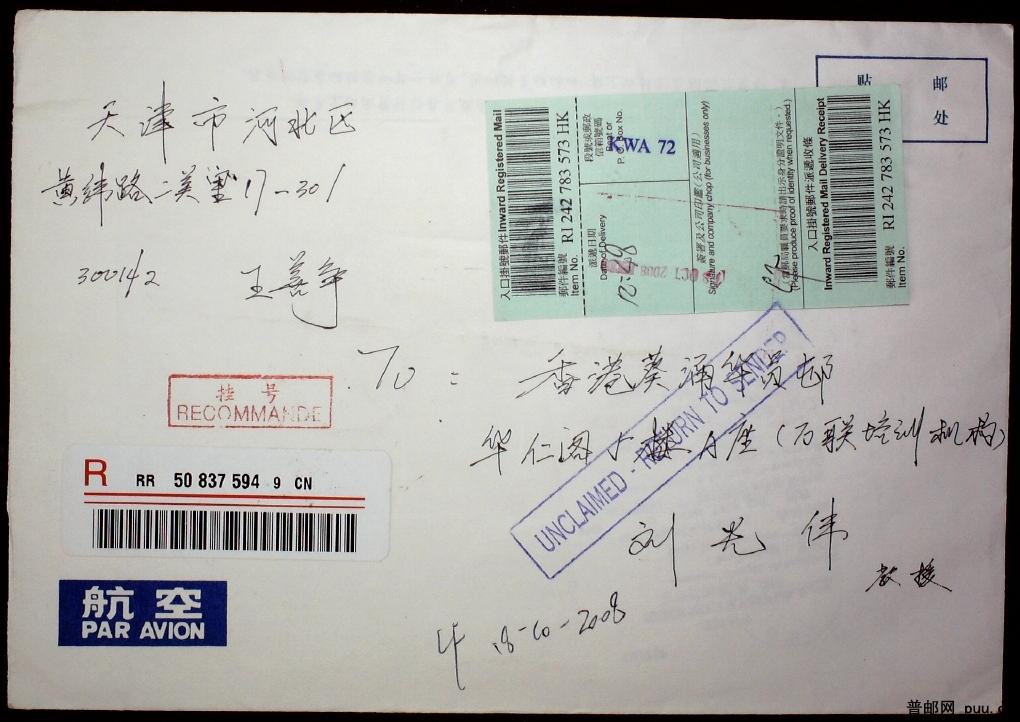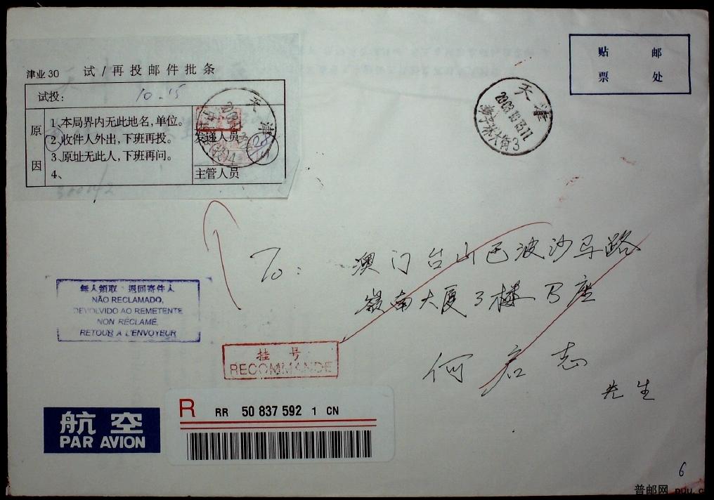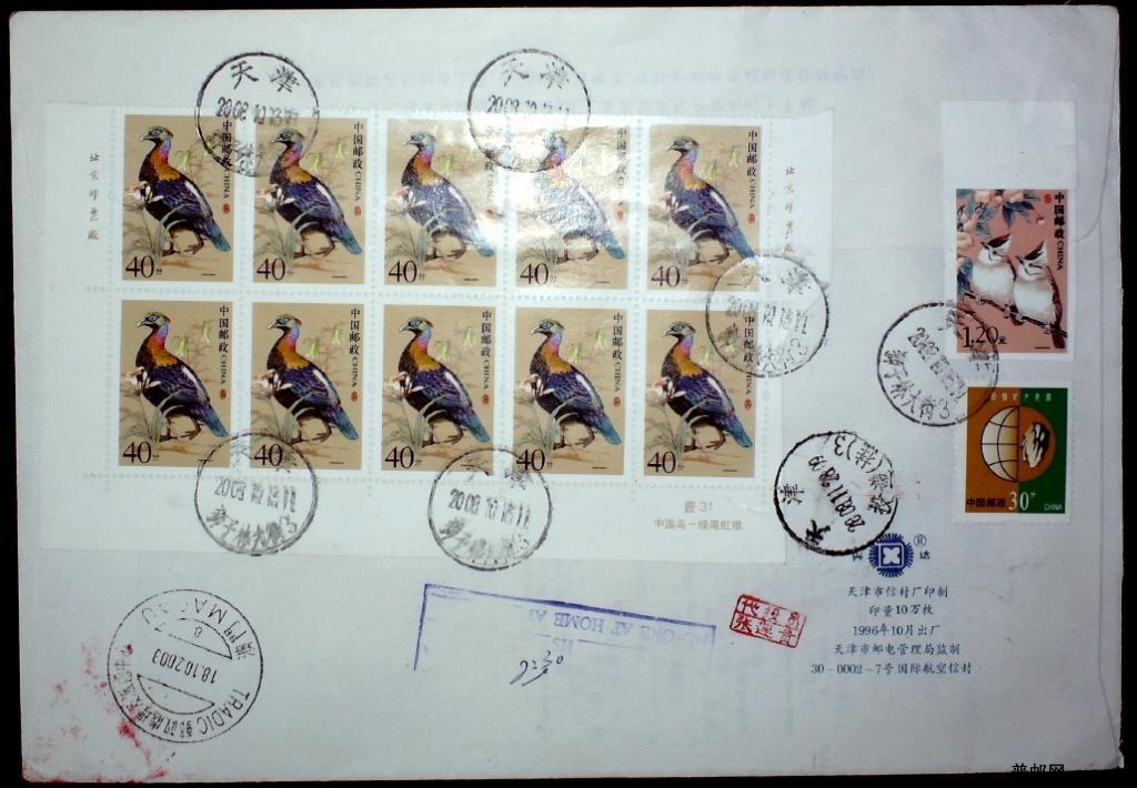 贴普31中国鸟1.2元赝品不同两种实寄香港、澳门退回航空挂号封各一枚