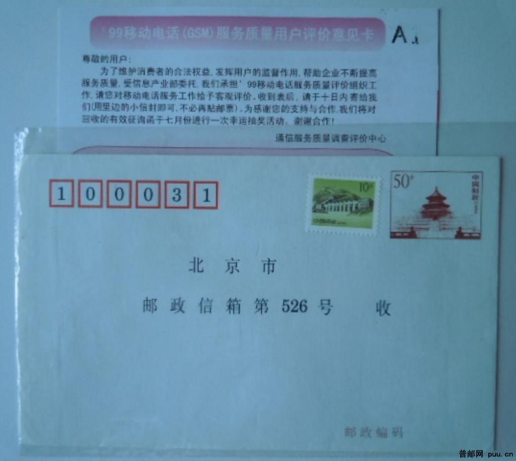 天坛526封移动版加贴10分长城票新(带移动电话服务质量征询函)